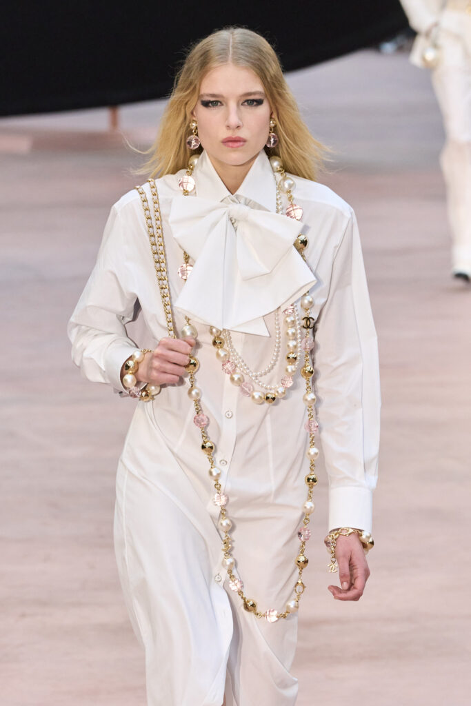 Certamente il modo migliore per indossare un fiocco (e il più visto in passerella) è quello di usarlo come chiusura di camicette e giacche. Da Emporio Armani il fiocco preferito è mini in velluto, mentre da Chloè è maxi e si annoda al collo della blusa. Da Chanel, invece, l’ufficio stile si è sbizzarrito: i fiocchi sono il dettaglio di ogni blusa, giacca, camicia o casacca. In velluto, ricamati con le perle, in raso o trasparenti, sembra che sia adatto ad ogni capo. Sono raffinatissimi, soprattutto, quelli ricamati con le perle e poi cuciti sulla maglia o ancora quelli piccoli in raso o velluto.
