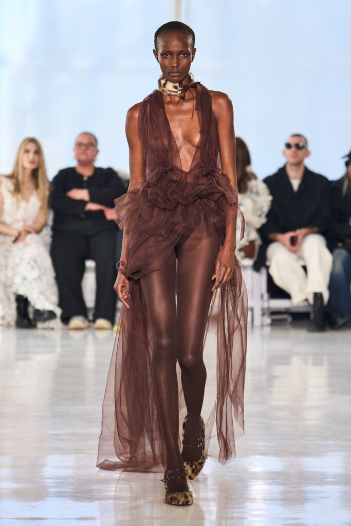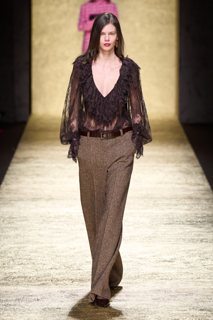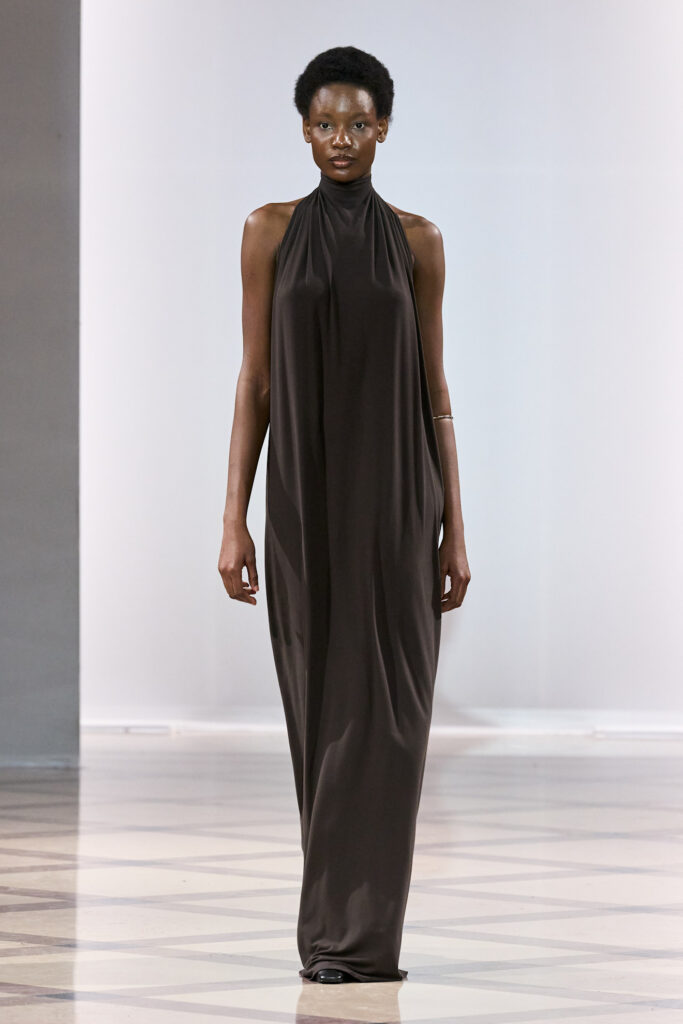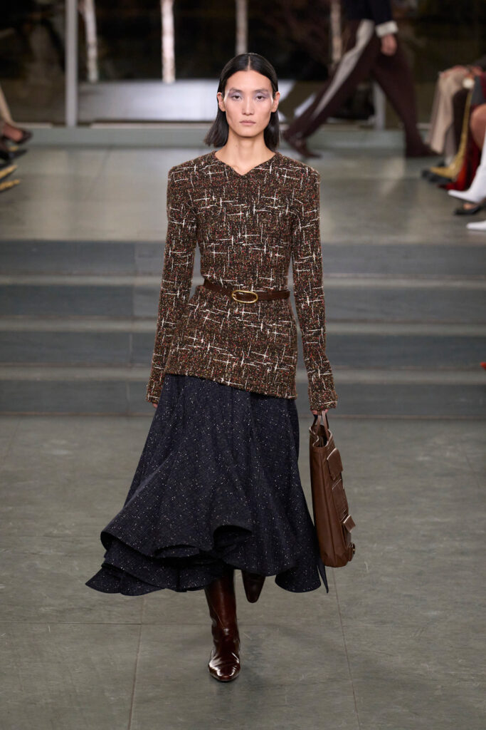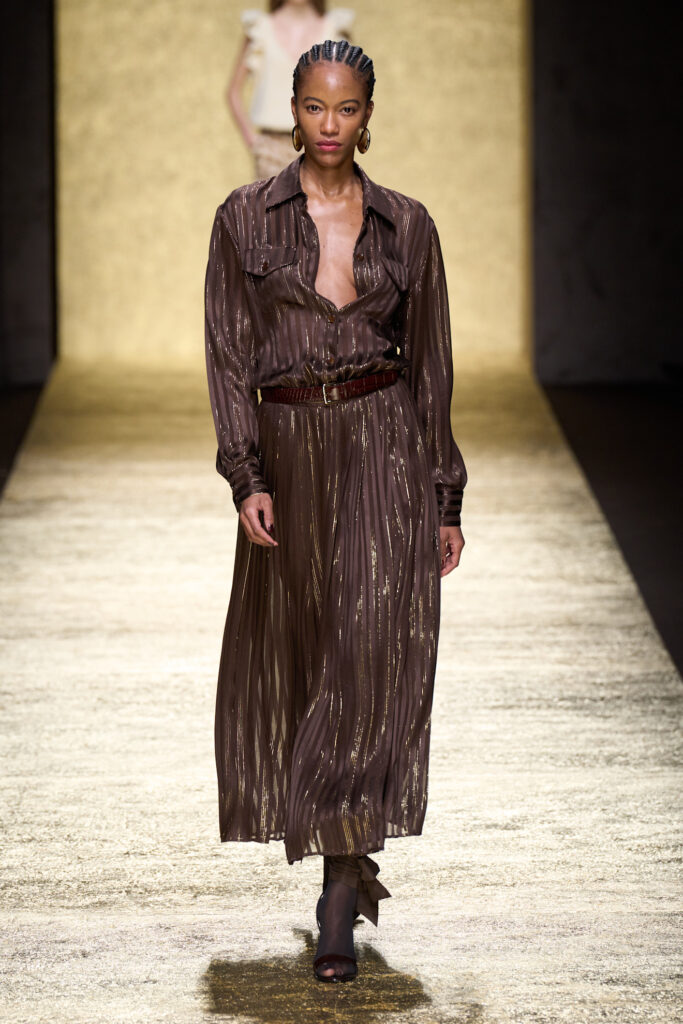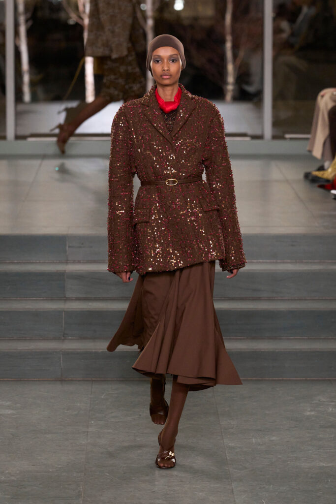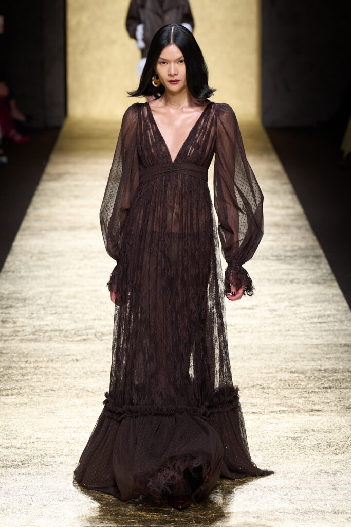 Infine, anche Elie Saab sceglie il marrone per costruire un guardaroba day-to-night: tailleur impeccabili e femminili per il giorno si alternano a lunghi abiti ricamati per la sera. Una couture che si affida alla potenza discreta del marrone per vestire ogni ora della giornata con un’eleganza senza tempo.