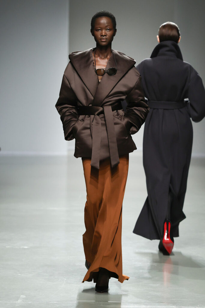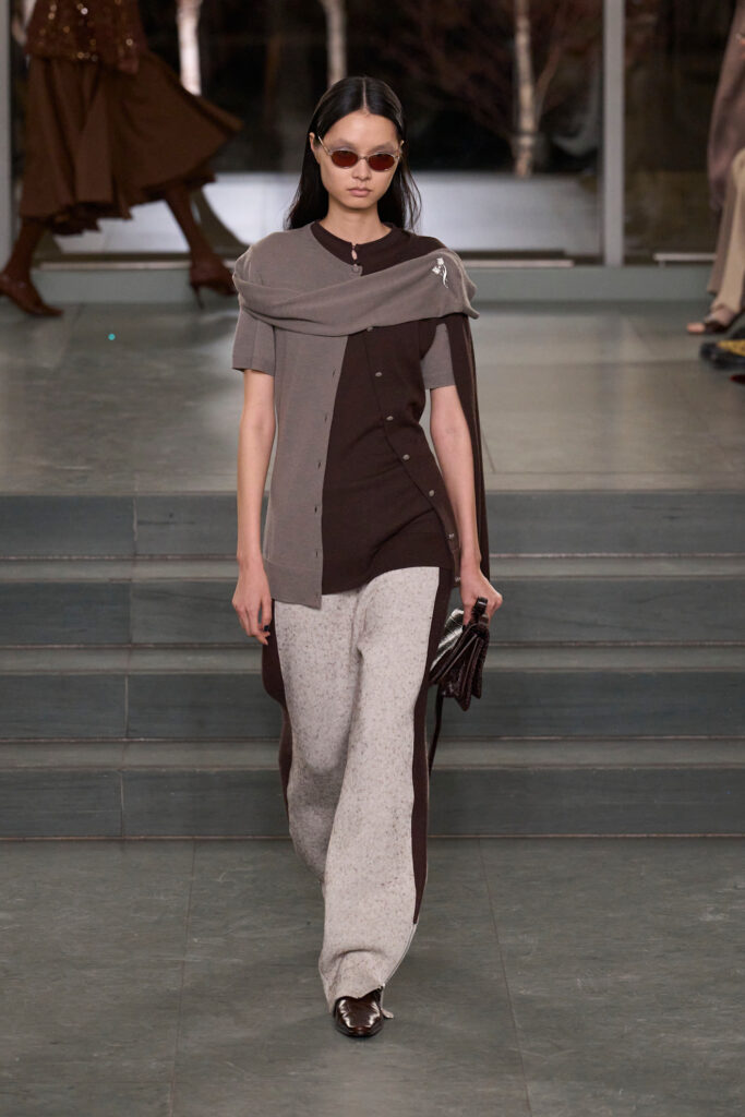 Sportmax introduce un marrone deciso e profondo, tendente all’espresso, con inflessioni più fredde e rossastre, che conferiscono alla collezione un rigore grafico e sofisticato.