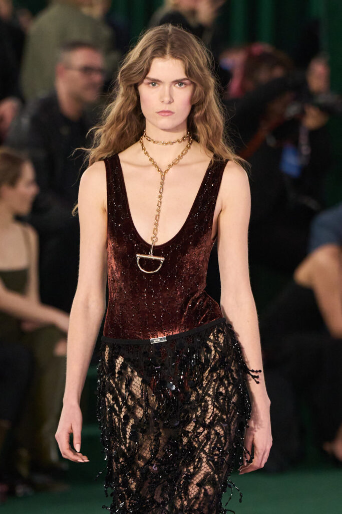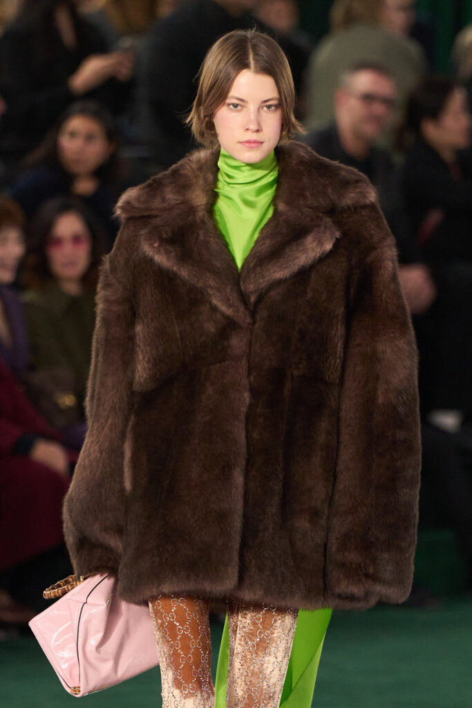 In una fase di transizione creativa, Gucci affida al marrone cioccolato il compito di ridefinire il proprio immaginario. Dismesso il Rosso Ancora caro a Sabato De Sarno, la maison punta su un cioccolato sofisticato per la maglieria minimal-chic, i tailleur in tweed, le pellicce e persino per la sera, con un body in velluto tempestato di cristalli tono su tono che riproduce l’iconica stampa GG. Gli abbinamenti oscillano tra audacia e rassicurazione: lilla e verdi acidi da una parte, burro e beige dall’altra, per una scala cromatica avvolgente e gourmand.