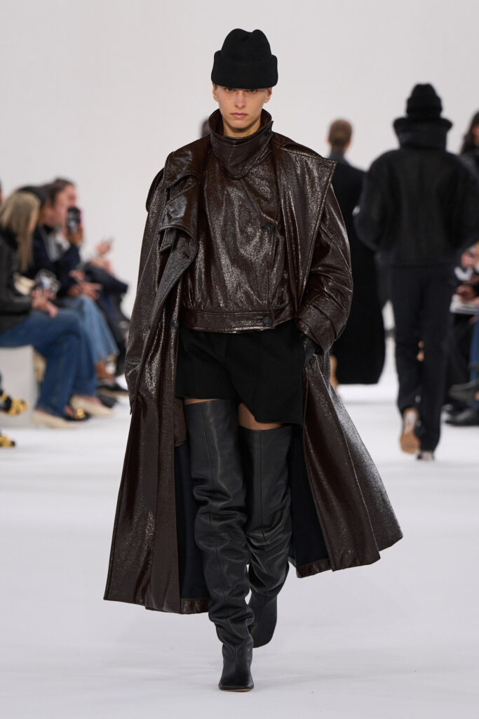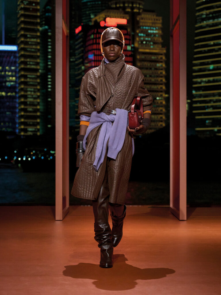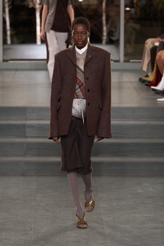 Hermès, fedele al suo savoir-faire, presenta total look in morbida nappa marrone, mixando diverse declinazioni di cioccolato, dal fondente al gianduia, in un raffinato esercizio di layering cromatico.