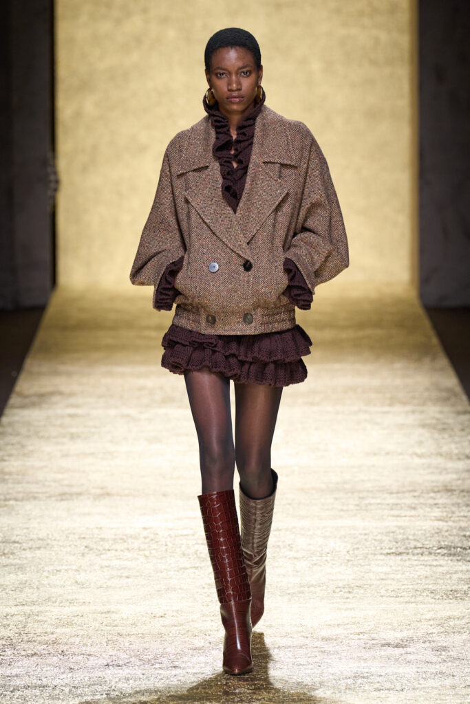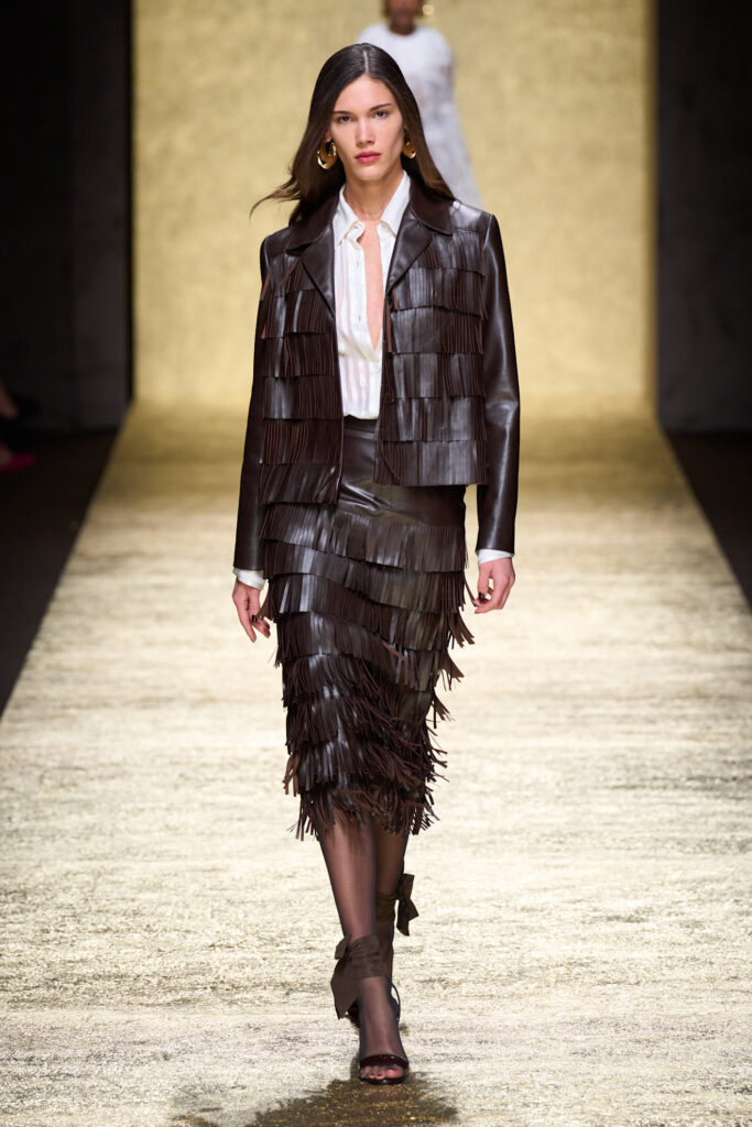 Sulla stessa linea, Luisa Spagnoli utilizza il marrone scuro con versatilità: di giorno su abiti voluminosi di chiffon, di sera in versioni più aggressive, con gonne in pelle a frange e maglie aderenti, accentuando la forza contemporanea del colore.