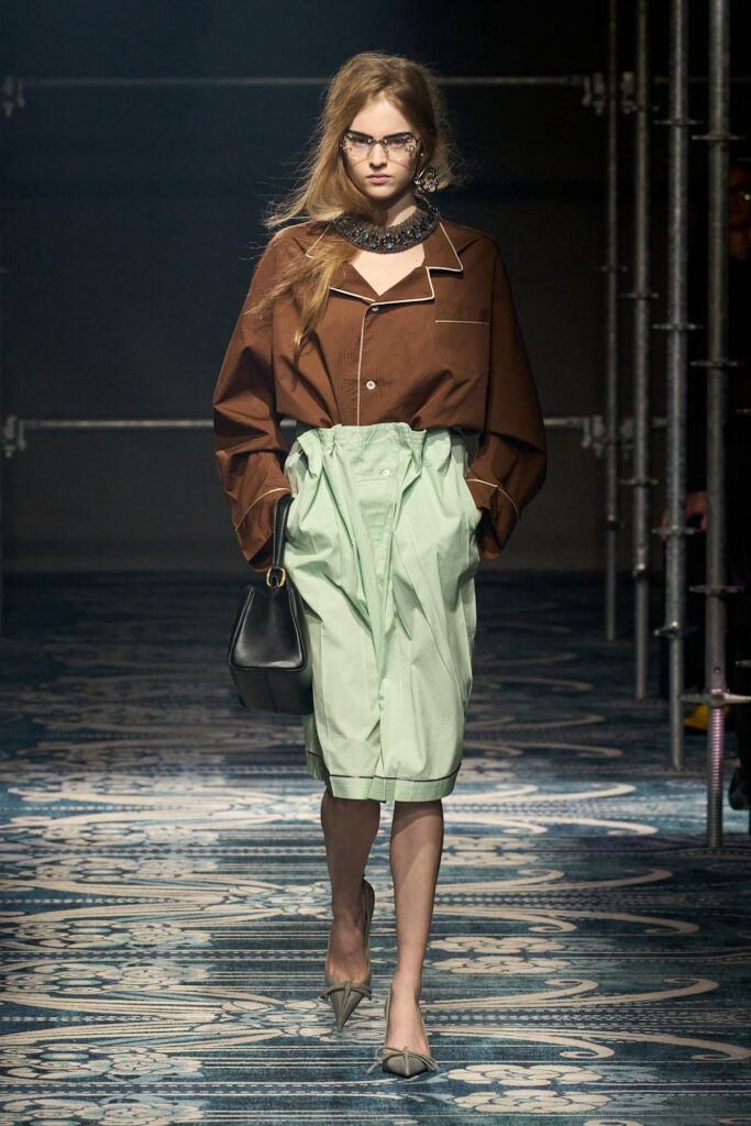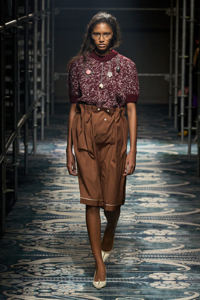 Miuccia Prada e Raf Simons eleggono il marrone cacao a protagonista assoluto della collezione. La palette è costruita come un racconto domestico e introspettivo: il cacao profondo e vellutato si alterna a rosa salmone chiarissimo, verde mousse di pistacchio e antracite. Capispalla in pelliccia, grisaglie reinterpretate in chiave bruna e silhouette volutamente oversize amplificano l’idea di un guardaroba intimo, quasi homewear, arricchito da dettagli rétro come le décolleté kitten heels.